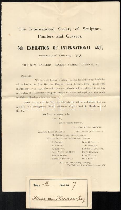 1904 A Londoni International Society of Sculptors, Painters and Engrav... https://www.darabanth.com/de/431-Fernauktion/431.0/Kunst-Dokumente-andere-Sammelgebiete/Historische-Dokumenten-Handschriften~5000022/1904-A-Londoni-International-Society-of-Sculptors-Painters-and-Engravers-meghivoja-es-levelei-KC3~II2775520