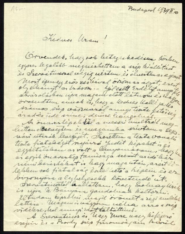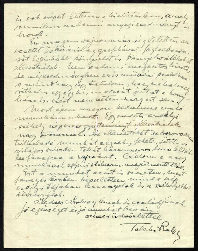 1939 Széki gróf Teleki Ralph (1890-1982) nagybányai festőművész és grafikus saját kézzel írt sorai Szolnay Sándor (1893-1950) festőművész részére, saját kezű aláírásával, 2 beírt oldal. "Örvendek, hogy sok betegeskedésem közben egyszer legalább megnézhettem a szép kiállítást, és Szervátiusszal végig néztem és élveztem az egészet. ... Szervátiusztól hallottam, hogy Szolnay Úrék is ujra N. Bányára gondolnak költözni. EL tudom képzelni majd örömét a régi emlékek láttára. Magam is vágyom néha arra a szép vidékre, hol annyi időt töltöttünk. A Szervatius és Nagy Imre nagy kifejező erején és Bordy (András) szép finomságain kívül is sok szépet láttam a kiállításban, amely remélem valami anyagi eredményt is hozott. ... Most ép(p)en nagyon kedvemre való munkám akadt. Egy eredeti erdélyi székely népmesegyűjteményt illusztrálok nagy örömmel."
