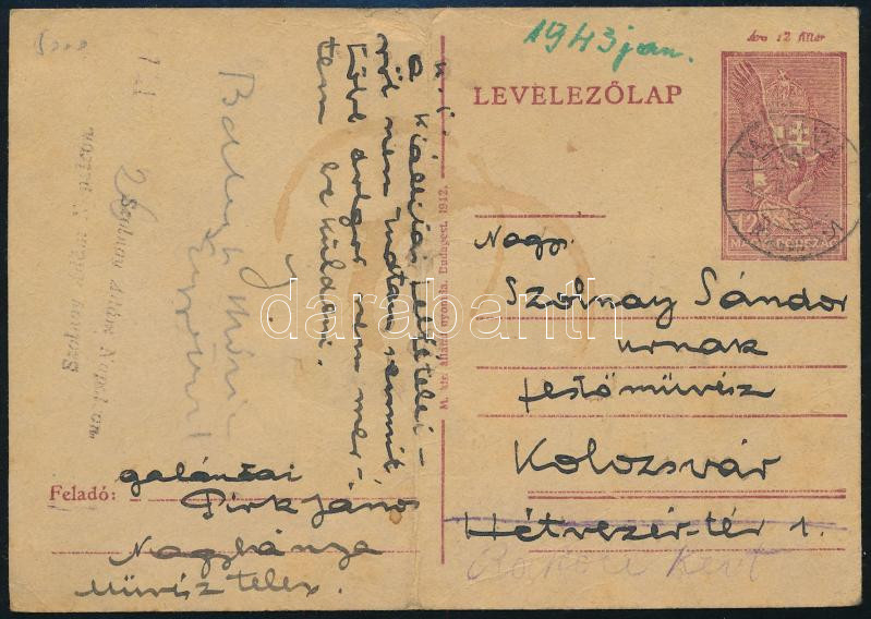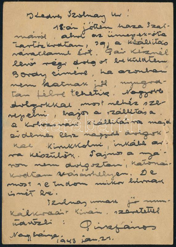 1943 Nagybánya, Pirk János (1903-1989) festőművész saját kézzel írt sorai Szolnay Sándor (1893-1950) festőművész részére, benne kiállításokra vonatkozó sorokkal, saját kezű aláírásával.