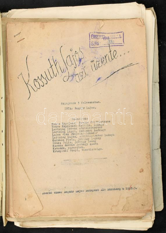 1945 Valgai hadifogolytáborban előadott színmű kéziratok 3 db Bognár L... https://www.darabanth.com/de/431-Fernauktion/431.0/Kunst-Dokumente-andere-Sammelgebiete/Historische-Dokumenten-Handschriften~5000022/1945-Valgai-hadifogolytaborban-eloadott-szinmu-keziratok-3-db-Bognar-Lajostol-Gepiratkent~II2767013