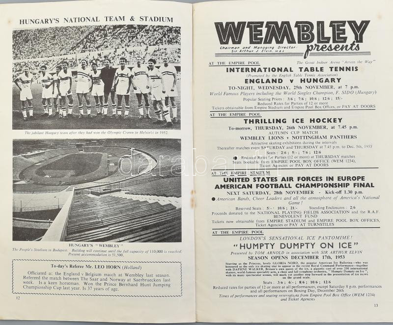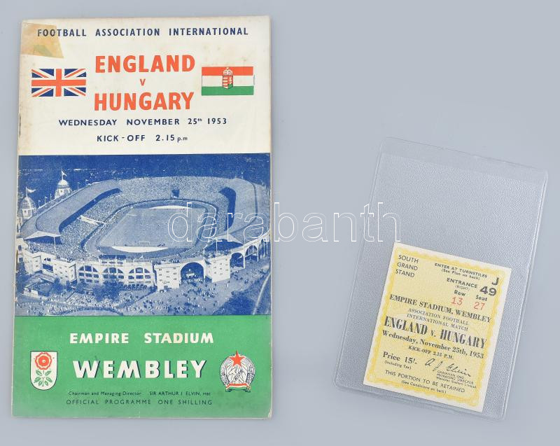 1953 Magyarország-Anglia, a legendás 6:3-as labdarúgó mérkőzés meccsfüzete, és egy belépőjegy a Wembley Stadionba, ahol az Aranycsapat legyőzte az évtizedek óta veretlen Angliát. A műsorfüzet hátsó borítója javított, részben pótolt, de a jegy jó állapotban. Rare! / 1953 Hungary - England 6:3, legendary football match booklet, and an entry ticket to the Wembley Stadium, where the Golden Team of Hungary defeated England. The back cover of the booklet partly incomplete, damaged, and repaired, but the ticket in good condition. Rare!