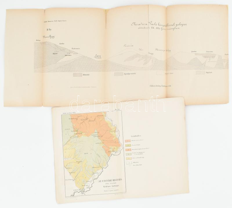 2 db ritkább térkép 1876 Moravicza Vaskő bányatelkeinek geológiai átmetszete. Litográfia 69x24 cm + 1874 Az Ungvári hegység délnyugati részének földtani térképe. Rybár J. Litográfia. 32x25 cm