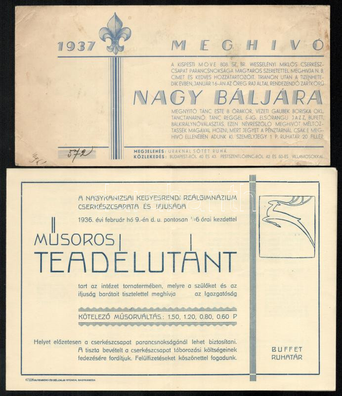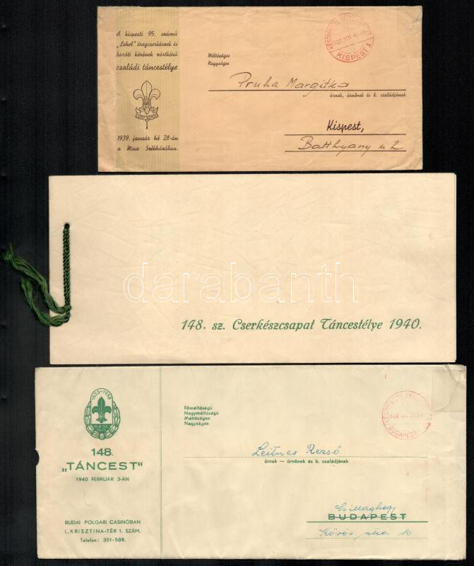 1936-1940 Táncesti, báli meghívók, 5 db https://www.darabanth.com/de/431-Fernauktion/431.0/Kunst-Dokumente-andere-Sammelgebiete/Pfadfinder~3000006/1936-1940-Tancesti-bali-meghivok-5-db~II2767157