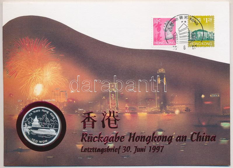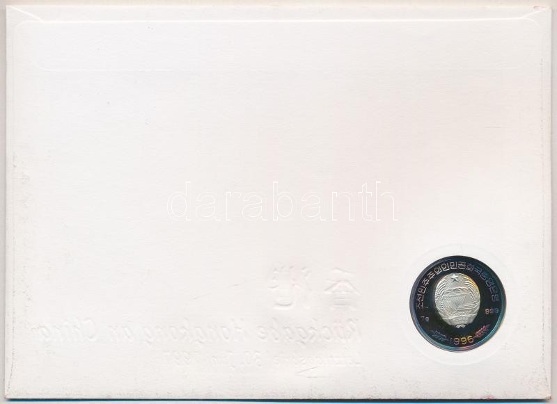 Észak- Korea 1996. 100W Ag "Honkong visszatérése" felbélyegzett borítékban, bélyegzéssel, német nyelvű tájékoztatóval T:1 North Korea 1996. 100 Won Ag "Return of Hong Kong" in envelope with stamp, cancellation and a prospectus in german C:UNC Krause KM#422