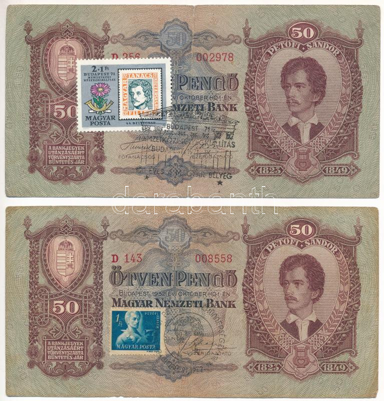 1932. 50P (2x) "Budapest 71 Nemzetközi Bélyegkiállítás" + &q... https://www.darabanth.com/de/431-Fernauktion/431.0/Numismatik/Ungarische-Banknoten~1500007/1932-50P-2x-Budapest-71-Nemzetkozi-Belyegkiallitas-plus-Belvarosi-Petofi-Emlekunnepsege~II2768138