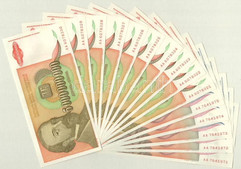 Beschreibung: Jugoszlávia 1993. 5.000.000.000D (10x) sorszámkövetők "AA 6078321 - AA 6078330" + 50.000.000.000D (5x) sorszámkövetők "AA 7641971 - AA 7641975" T:I- halvány vízfolt