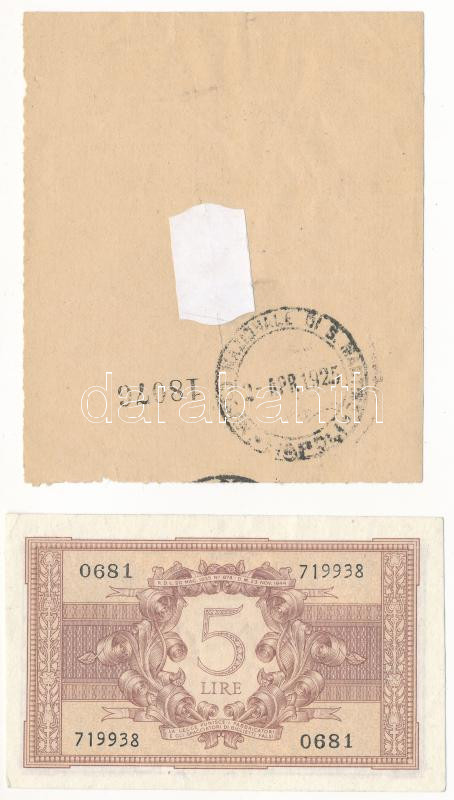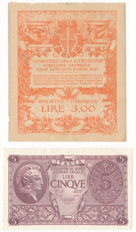 Italy 1944. 5 Lire + 1925. Ticket to the Ministry of Education Directorate-General for Antiquities and Fine Arts in value of 3 Lire C:F,VG