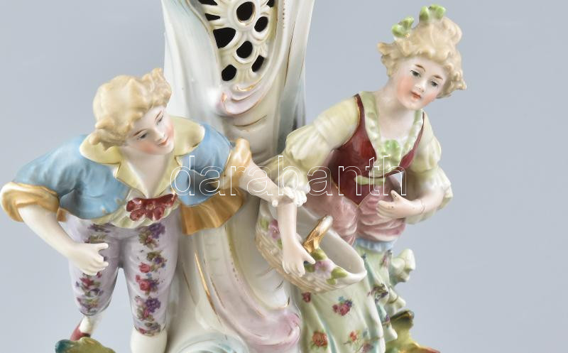 Beschreibung: Jelzés nélkül: Rokokó szerelmi jelenetet ábrázoló gyertyatartó. Kézzel festett, kisebb lepattanásokkal. 36 cm