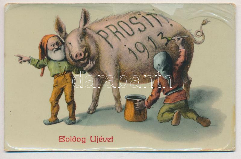 Boldog újévet! Törpék malaccal / Prosit 1913 / New Year greeting, dwar... https://www.darabanth.com/de/432-Fernauktion/432.0/Ansichtskarten/GruC39Fkarten-Feste~2000051/Boldog-ujevet-Torpek-malaccal-Prosit-1913-New-Year-greeting-dwarves-with-pig-fa~II2779905