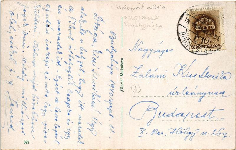 Beschreibung: 1940 Huszt, Chust, Khust; görögkeleti fatemplom, vasúti viadukt / Orthodox wooden church, railway viaduct + "KÖRÖSMEZŐ-BUDAPEST 33." vasúti mozgóposta