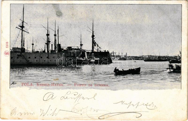 ~1900 Pola, Pula; K.u.K. Kriegsmarine Kriegshafen / Porto di guerra / ... https://www.darabanth.com/de/432-Fernauktion/432.0/Ansichtskarten/Kriegsschiffe~2000025/7E1900-Pola-Pula-KuK-Kriegsmarine-Kriegshafen-Porto-di-guerra-Osztrak-magyar-haditengeresz~II2781407