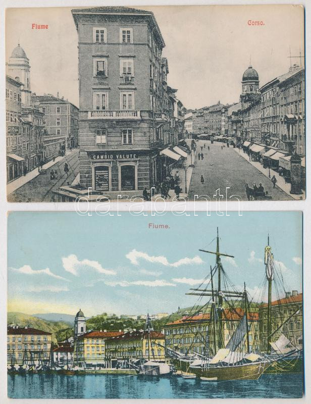 Fiume, Rijeka; 2 db régi képeslap (korzó, valutaváltó) / 2 pre-1945 po... https://www.darabanth.com/de/432-Fernauktion/432.0/Ansichtskarten/Kroatien~2000009/Fiume-Rijeka-2-db-regi-kepeslap-korzo-valutavalto-2-pre-1945-postcards~II2783438