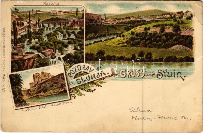 Szluin, Sluin, Slunj; Raztoke, Slunj, Ruscvina Slovin / vízesés, látkép, várrom / waterfall, general view, castle ruins. Verlag v. Heinrich Krapek Art Nouveau, floral, litho (szakadás / tear)