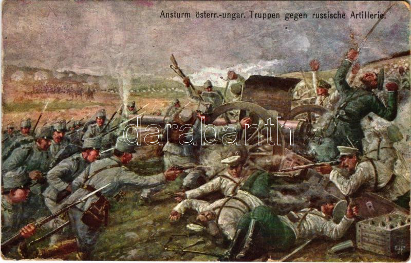 1915 Ansturm österreichisch-ungarischer Truppen gegen russische Artillerie. Offizielle Postkarte für das Rote Kreuz Kriegsfürsorgeamt und Kriegshilfsbüro / WWI Austro-Hungarian K.u.K. military art postcard, attacking Russian artillery (kis szakadás / small tear)