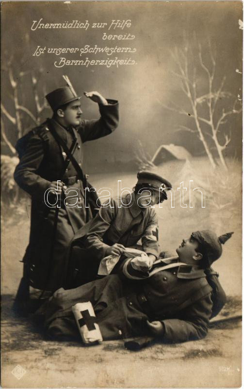 1915 Unermüdlich zur Hilfe bereit ist unserer Schwestern Barmherzigkeit / Első világháborús német romantikus lap sérült katonával / WWI German romantic military with injured soldier (fl)