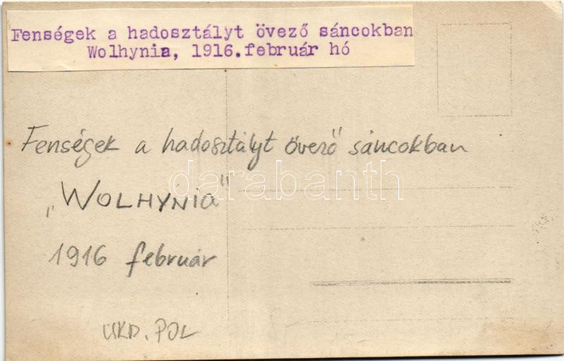 1916 Wolhynia, Volhynia; fenségek a hadosztályt övező sáncokban februá... https://www.darabanth.com/de/432-Fernauktion/432.0/Ansichtskarten/Militaria~2000033/1916-Wolhynia-Volhynia-fensegek-a-hadosztalyt-ovezo-sancokban-februarban-az-orosz-fronton-~II2783594