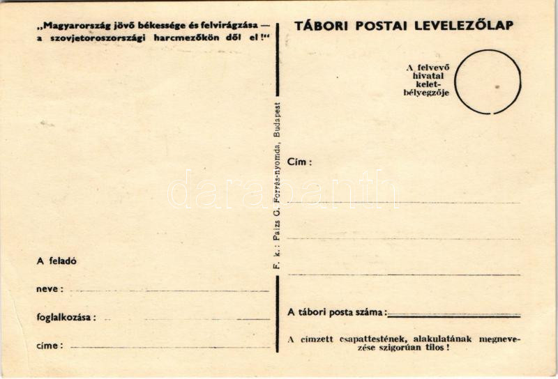 "Magyarország jövő békessége és felvirágzása - a szovjetoroszországi harmezőkön dől el!" 1942 Karácsonya Harcoló honvédeinké és hozzátartozóiké. Leventeifjúság honvédkarácsonya. Tábori Postai Levelezőlap / WWII Hungarian military field postcard with Christmas greeting s: Légrády S. (EB)