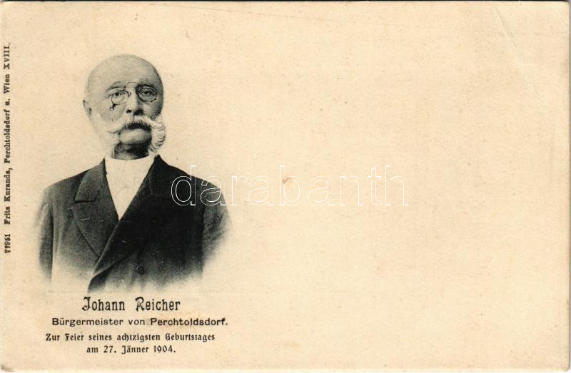 Perchtoldsdorf, Johann Reicher, Bürgermeister von Perchtoldsdorf. Zur Feier seines achtzigsten Geburtstages am 27. Jänner 1904. / Memorial postcard to celebrate the 80th birthday of Johann Reicher, Mayor of Perchtoldsdorf. Verlag Fritz Kuranda (EB)
