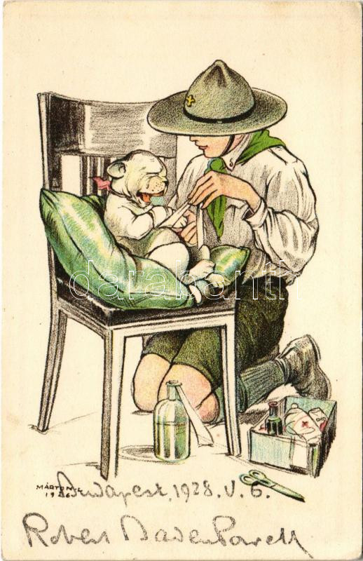 1932 A cserkész ahol tud, segít. Kiadja a Magyar Cserkészszövetség Nagytábortanácsa 1926 - 1932-es táti táborból küldve / Hungarian scout boy art postcard s: Márton L. (EK)