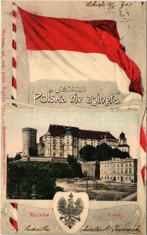 1906 Kraków, Krakkó, Krakau; Wawel. Jeszcze Polska nie Zginela / Royal Castle. Art Nouveau frame with Polish coat of arms, flag and patriotic propaganda