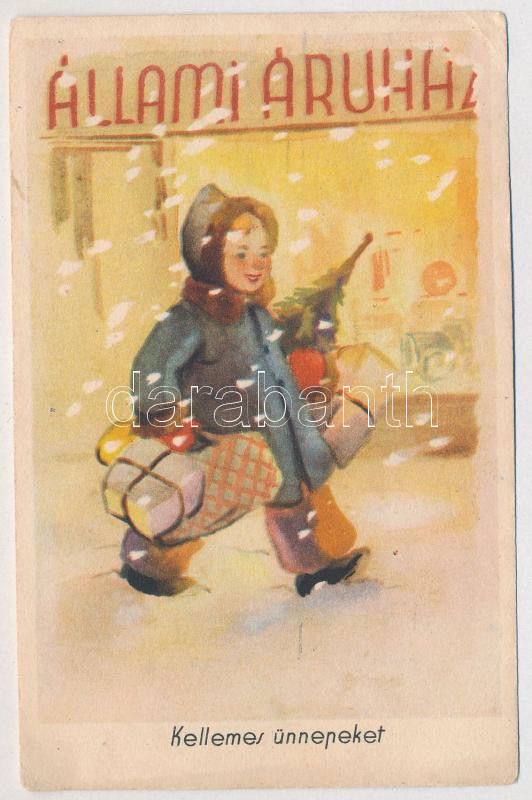 Beschreibung: 1953 Kellemes ünnepeket! Szocreál propaganda, Állami Áruház reklámlap. Képzőművészeti Alap Kiadóvállalat / Hungarian communist propaganda, Christmas greeting art postcard, advertisement (EK)