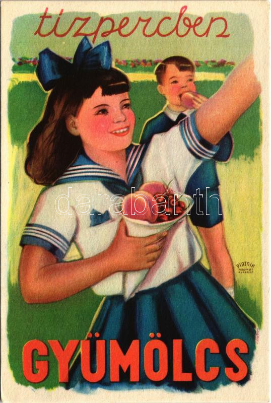 Tízpercben gyümölcs! Magyar egészségügyi propaganda, C-vitamin táblázat a hátoldalon. M. kir. Földművelésügyi Minisztérium kiadványa / Hungarian health campagin propaganda, C-Vitamin chart on the backside s: Vöczköndy (EK)