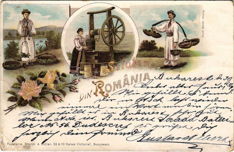 1898 (Vorläufer) Salutari din Romania... / Greetings from Romania! Romanian folklore, traditional costumes. Papeterie Storck & Müller, Louis Glaser Art Nouveau, floral, litho (EB)