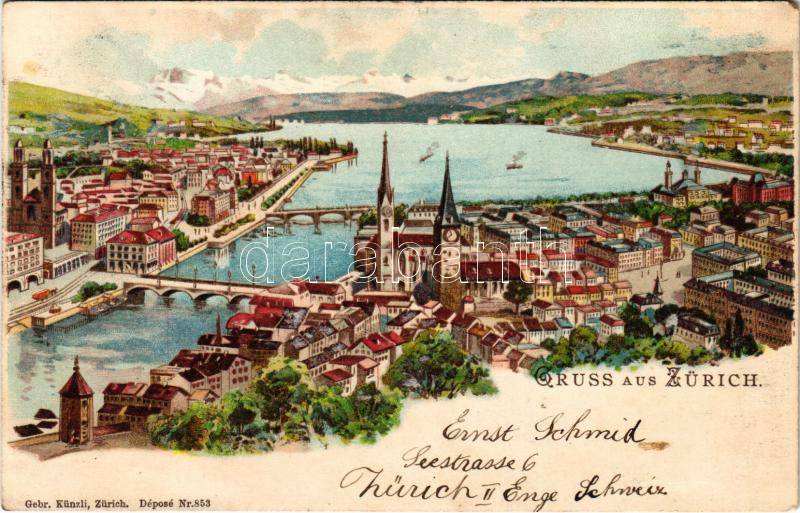 1899 (Vorläufer) Zürich, Zurich; general view. Gebr. Künzli litho (EK) https://www.darabanth.com/de/432-Fernauktion/432.0/Ansichtskarten/Schweiz~2000084/1899-Vorlaufer-Zurich-Zurich-general-view-Gebr-Kunzli-litho-EK~II2776943