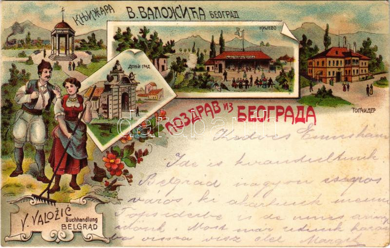 Beschreibung: Belgrade, Belgrád, Beograd; Kijevo, Topcider, Donji Grad, Serbian folklore. V. Valozic Buchhandlung Art Nouveau, floral, litho (Rb)