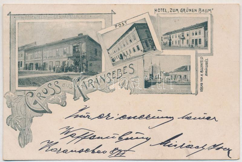 1899 (Vorläufer) Karánsebes, Caransebes; H. Rosenfeld üzlete, posta, Szálloda a Zöld fához, izraelita templom, zsinagóga. H. Rosenfeld saját kiadása / shop, post office, hotel, synagogue. Art Nouveau, floral