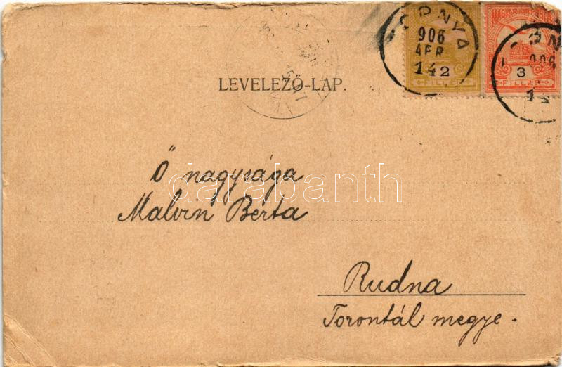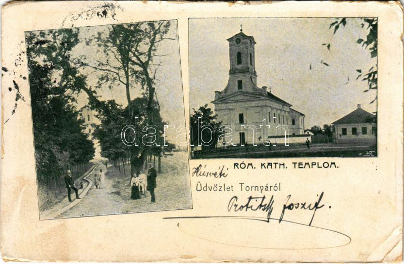 Beschreibung: 1906 Tornya, Pornya, Turnu (Arad); sétány, római katolikus templom / promenade, Roman Catholic church (kopott élek / worn edges)