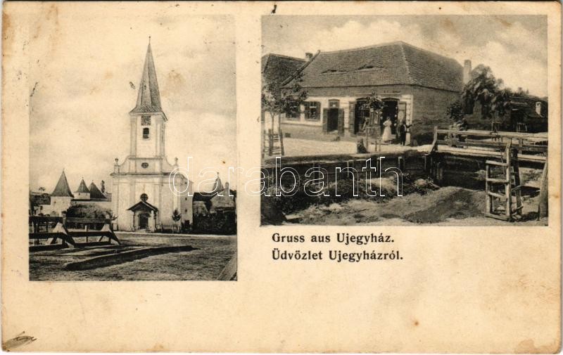 Beschreibung: 1908 Újegyház, Leschkirch, Nocrich; Evangélikus templom, J. Bernhardt üzlete és saját kiadása / Lutheran church, shop (EK)