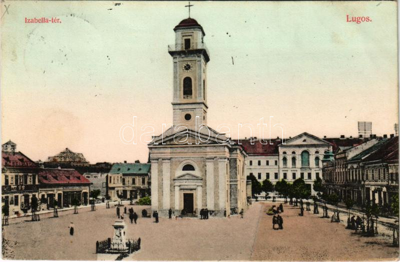 1909 Lugos, Lugoj; Izabella tér, templom, Rosenthal Adolf, Grosz Ignác... https://www.darabanth.com/de/432-Fernauktion/432.0/Ansichtskarten/Siebenburgen~2000006/1909-Lugos-Lugoj-Izabella-ter-templom-Rosenthal-Adolf-Grosz-Ignac-utoda-uzlete-Nemes-Kalm~II2787973