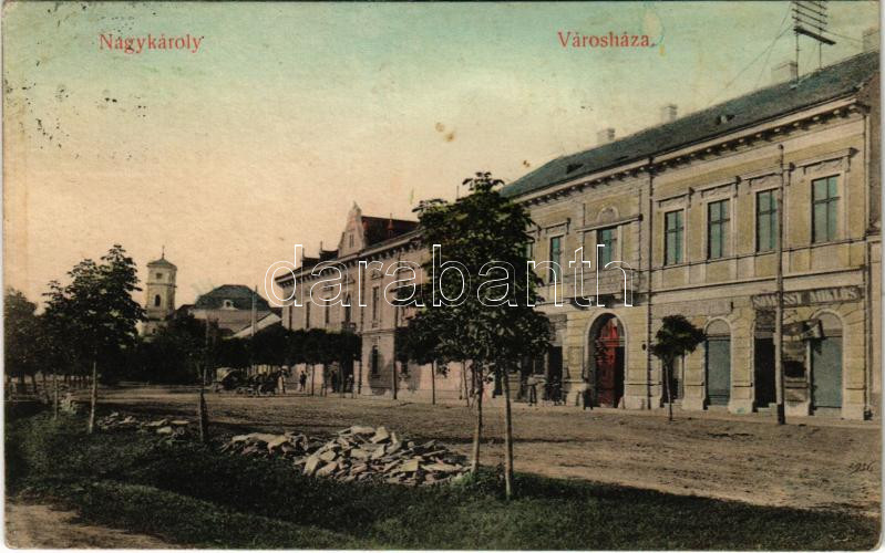 1909 Nagykároly, Carei; Római katolikus templom, Városháza, Somossy Mi... https://www.darabanth.com/de/432-Fernauktion/432.0/Ansichtskarten/Siebenburgen~2000006/1909-Nagykaroly-Carei-Romai-katolikus-templom-Varoshaza-Somossy-Miklos-uzlete-Csokas-LC3~II2781166