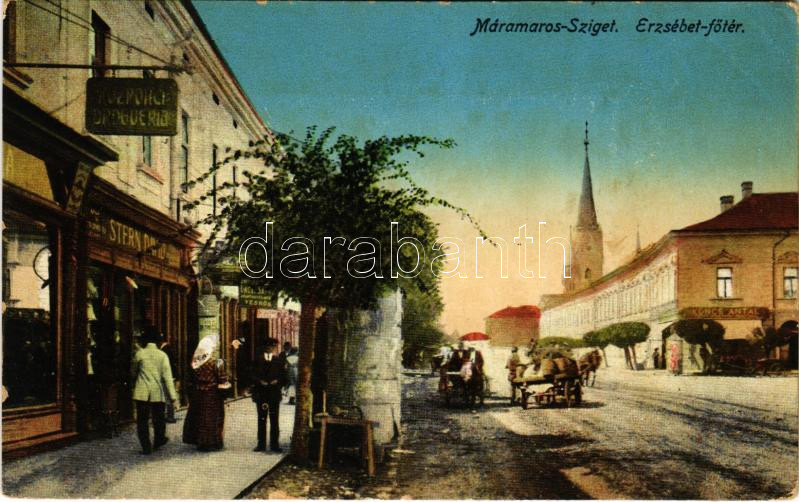 1915 Máramarossziget, Sighetu Marmatiei; Erzsébet főtér, Központi drogéria, Stern Dávid, Ungár Sándor vésnök és Köncs Antal üzlete / square, drogueria, shops