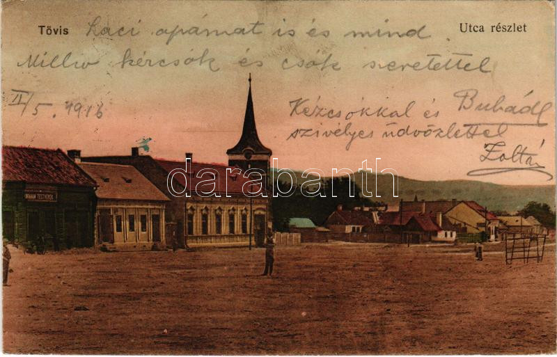 1916 Tövis, Teius; utca részlet, Ábrahám Testvérek üzlete, templom. Va... https://www.darabanth.com/de/432-Fernauktion/432.0/Ansichtskarten/Siebenburgen~2000006/1916-Tovis-Teius-utca-reszlet-Abraham-Testverek-uzlete-templom-Vasuti-LevelezolaparusC3~II2781183