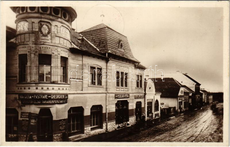 1940 Gyergyószentmiklós, Gheorgheni; Ferdinand király utca, Gyergyói első takarékpénztár, "A Kereszthez", Miklós Ottó, E. Bajnai és Pátria üzlete / Strada Regele Ferdinand / street, saving bank, shops + "1940 Gyergyószentmiklós visszatért" So. Stpl