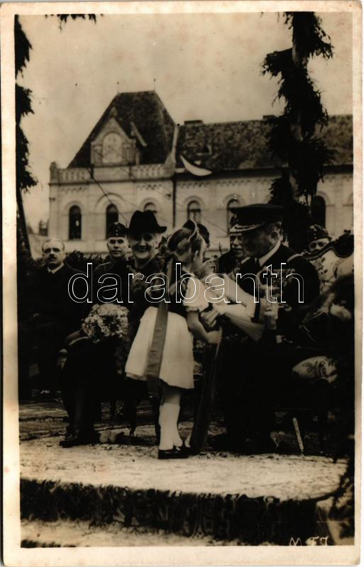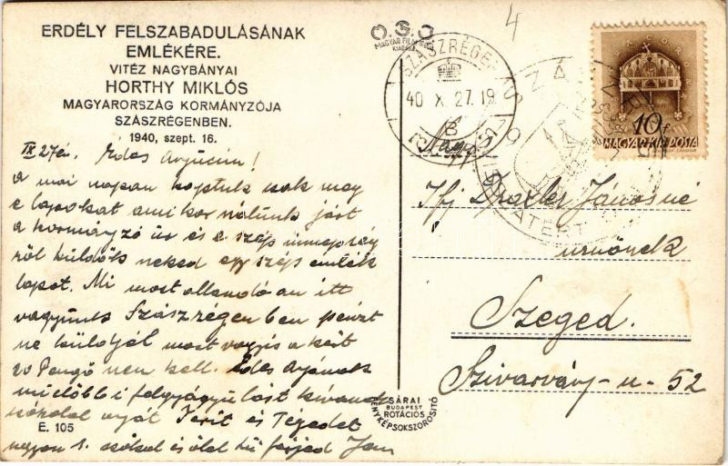 1940 Szászrégen, Reghin; bevonulás, Vitéz Nagybányai Horthy Miklós Magyarország kormányzója és Purgly Magdolna / entry of the Hungarian troops, Regent Horthy and his wife + "1940 Szászrégen visszatért" So. Stpl. (fl)