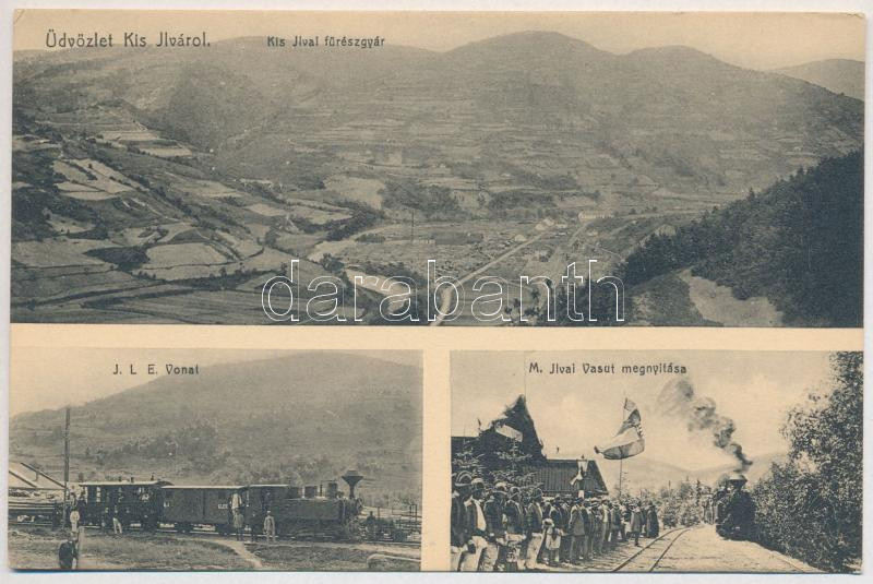 Kisilva, Ilva Mica; Kis-Ilvai fűrészgyár, I.L.E. vonat, M. Ilvai vasút megnyitása, vasútállomás, magyar zászló, gőzmozdony. Atelier Häusler (Bistritz) / sawmill, industrial railway, train, opening ceremony of the railway station with locomotive and Hungarian flag (EK)