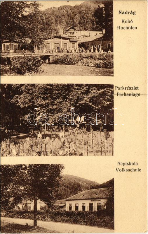 Nadrág, Nadrag, Steinacker; Vasgyár, Kohó, Park, Népiskola. Rusz Árpád kiadása / iron factory, ironworks, blast furnace, park, school (EK)