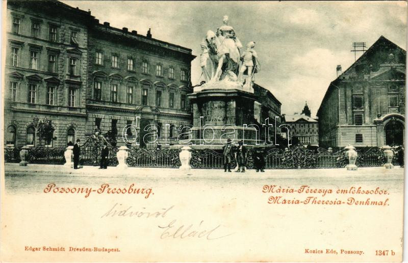 Beschreibung: 1899 (Vorläufer) Pozsony, Pressburg, Bratislava; Mária Terézia emlékszobor. Kozics Ede kiadása / Maria-Theresia-Denkmal / monument, street view