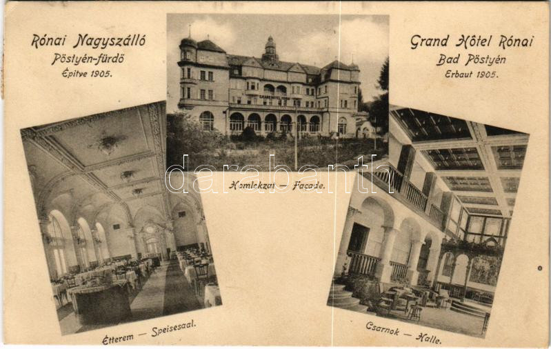 1908 Pöstyén-fürdő, Kúpele Piestany; Rónai nagyszálló, homlokzat, étte... https://www.darabanth.com/de/432-Fernauktion/432.0/Ansichtskarten/Slowakei~2000007/1908-Postyen-furdo-Kupele-Piestany-Ronai-nagyszallo-homlokzat-etterem-csarnok-belso-~II2715299
