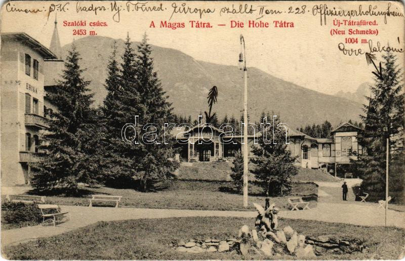 Beschreibung: 1915 Újtátrafüred, Neu-Schmecks, Novy Smokovec (Magas-Tátra, Vysoké Tatry); Szalóki csúcs, Kávéház, Erika Villa / cafe shop, villa hotel (EB)