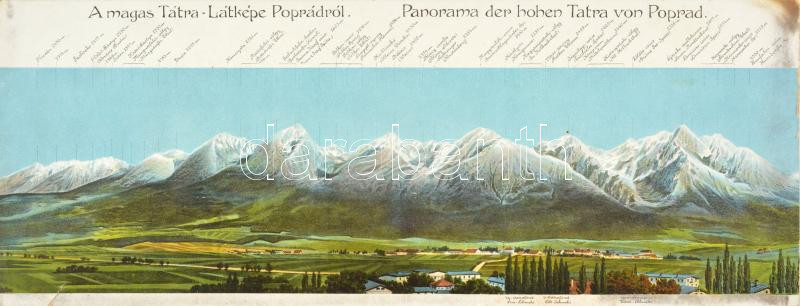 Beschreibung: Tátra, Magas-Tátra, Vysoké Tatry; Látkép Poprádról. 4-részes hajtatlan panorámalap / 4-tiled unfolded panoramacard (szakadás / tear) (36 x 13,9 cm)
