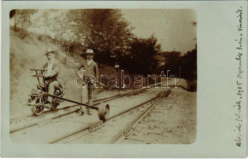 1905 Alcsút-Felcsút, vasútvonal, sínkerékpár / railway bicycle. photo https://www.darabanth.com/de/432-Fernauktion/432.0/Ansichtskarten/Ungarn~2000005/1905-Alcsut-Felcsut-vasutvonal-sinkerekpar-railway-bicycle-photo~II2780396