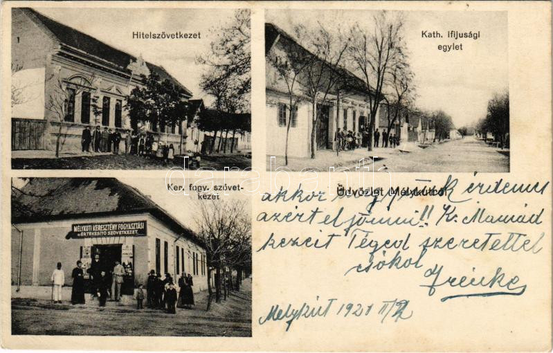 Beschreibung: 1921 Mélykút (Jánoshalma), Hitelszövetkezet, Katolikus Ifjúsági Egylet, Keresztény Fogyasztási és Értékesítő Szövetkezet üzlete és saját kiadása