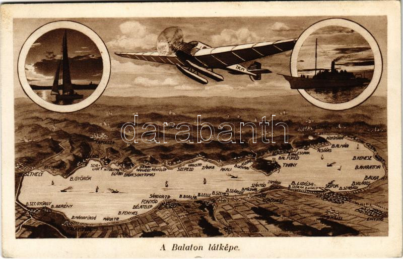 Balaton, térkép, hidroplán, gőzhajó, vitorlás https://www.darabanth.com/de/432-Fernauktion/432.0/Ansichtskarten/Ungarn~2000005/Balaton-terkep-hidroplan-gozhajo-vitorlas~II2780632