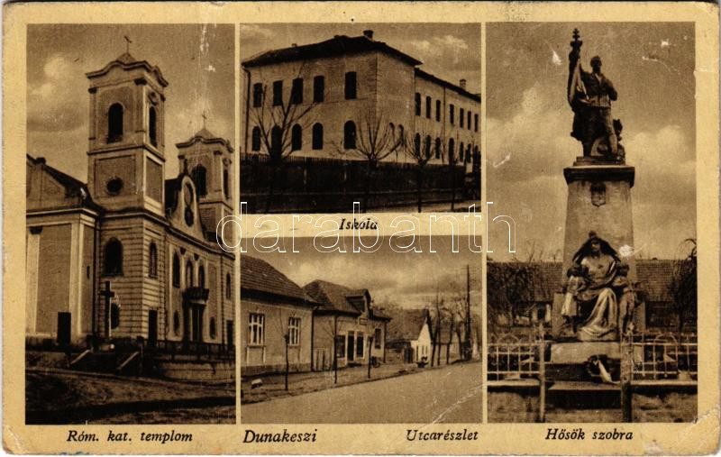Dunakeszi, Római katolikus templom, Iskola, utca részlet, Hősök szobra... https://www.darabanth.com/de/432-Fernauktion/432.0/Ansichtskarten/Ungarn~2000005/Dunakeszi-Romai-katolikus-templom-Iskola-utca-reszlet-Hosok-szobra-emlekmu-Penzar-kiad~II2779981