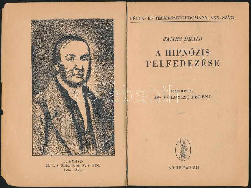 Braid, James: A hipnózis felfedezése. Ismerteti Dr. Völgyesi Ferenc. B... https://www.darabanth.com/de/432-Fernauktion/432.0/Bucher/Bucher-Andere-kuriositaten~1000037/Braid-James-A-hipnozis-felfedezese-Ismerteti-Dr-Volgyesi-Ferenc-Bp1948-Athenaeum-129-lplus-1-~II2782245