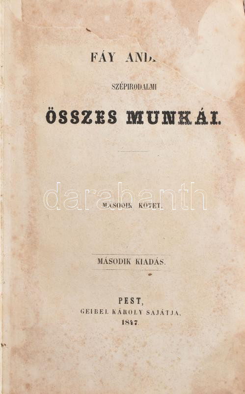 Fáy András szépirodalmi összes munkái. II. köt. Pest, 1847, Geibel Károly, 1 t. + XXIII+265 p. Második kiadás. Átkötött félvászon-kötésben, kissé kopott borítóval, foltos lapokkal, a címkép és a címlap sérült, hiányos.